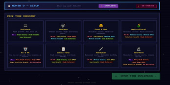 Pick from 8 industries — from AI & ML to Grocery to Handyman — each with different growth rates, costs, and risks. Software scales fast but so do salaries. Agricultural can boom or bust in a bad season. Low-growth industries need smart investments or borrowing to ever reach the finish line. Some industries will not have VC investments - sorry, that's just the reality.