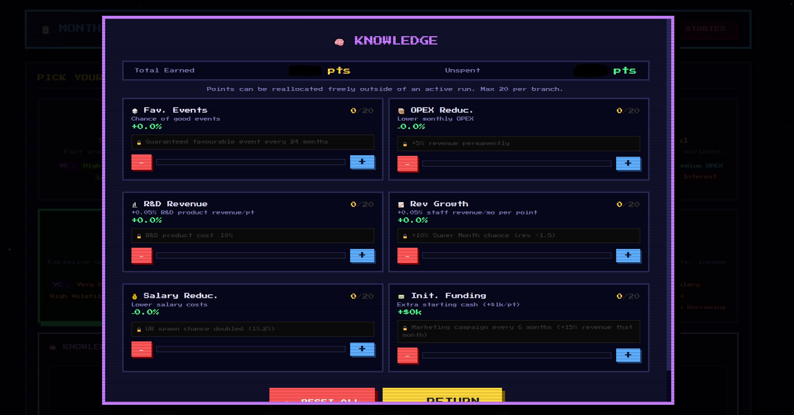 Once you hit Unicorn, the run is over. You get knowledge points based on the result of the run, plus calculated points from your Personal Net Worth - while VC is super helpful in giving you cash, just remember that it also takes some of your PNW away. Spend the knowledge points on any branches, and you can change them between runs. Once a branch has full 20 points, a strong bonus effect will be applied to future games!